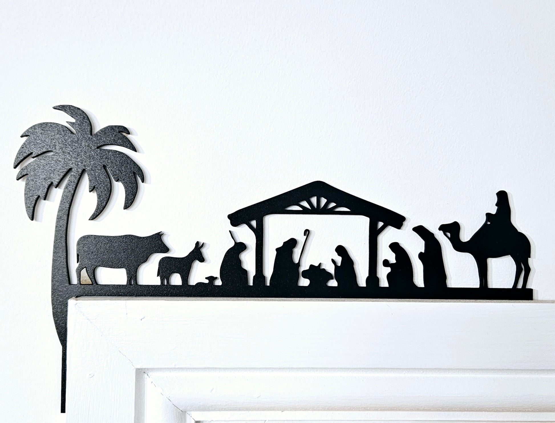 Made from durable 3mm MDF, this silhouette captures the holy night in intricate detail – featuring the manger, wise men, animals, and star of Bethlehem. Available in black or white, it can be placed as a door corner trim, shelf sitter, or mantelpiece accent.